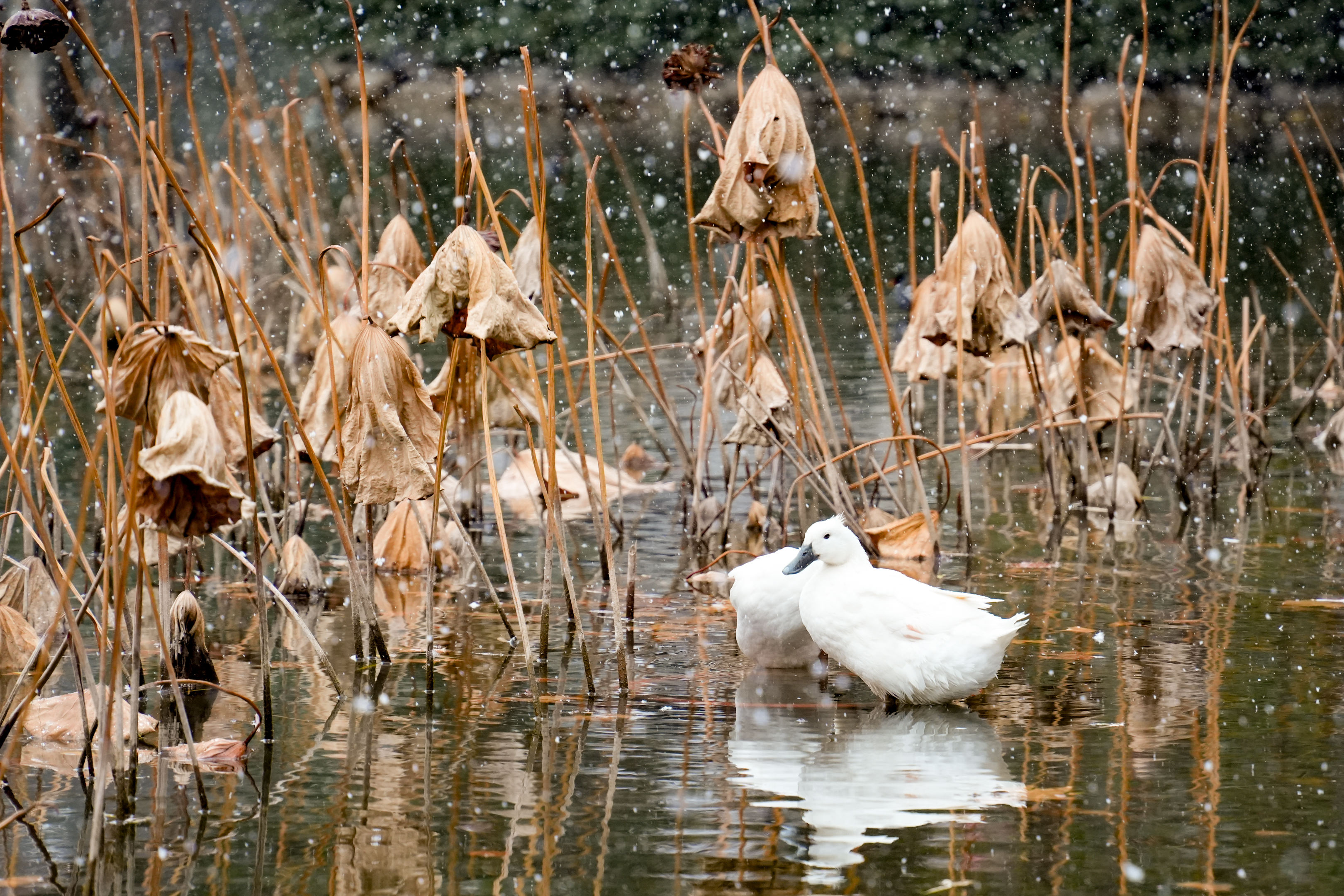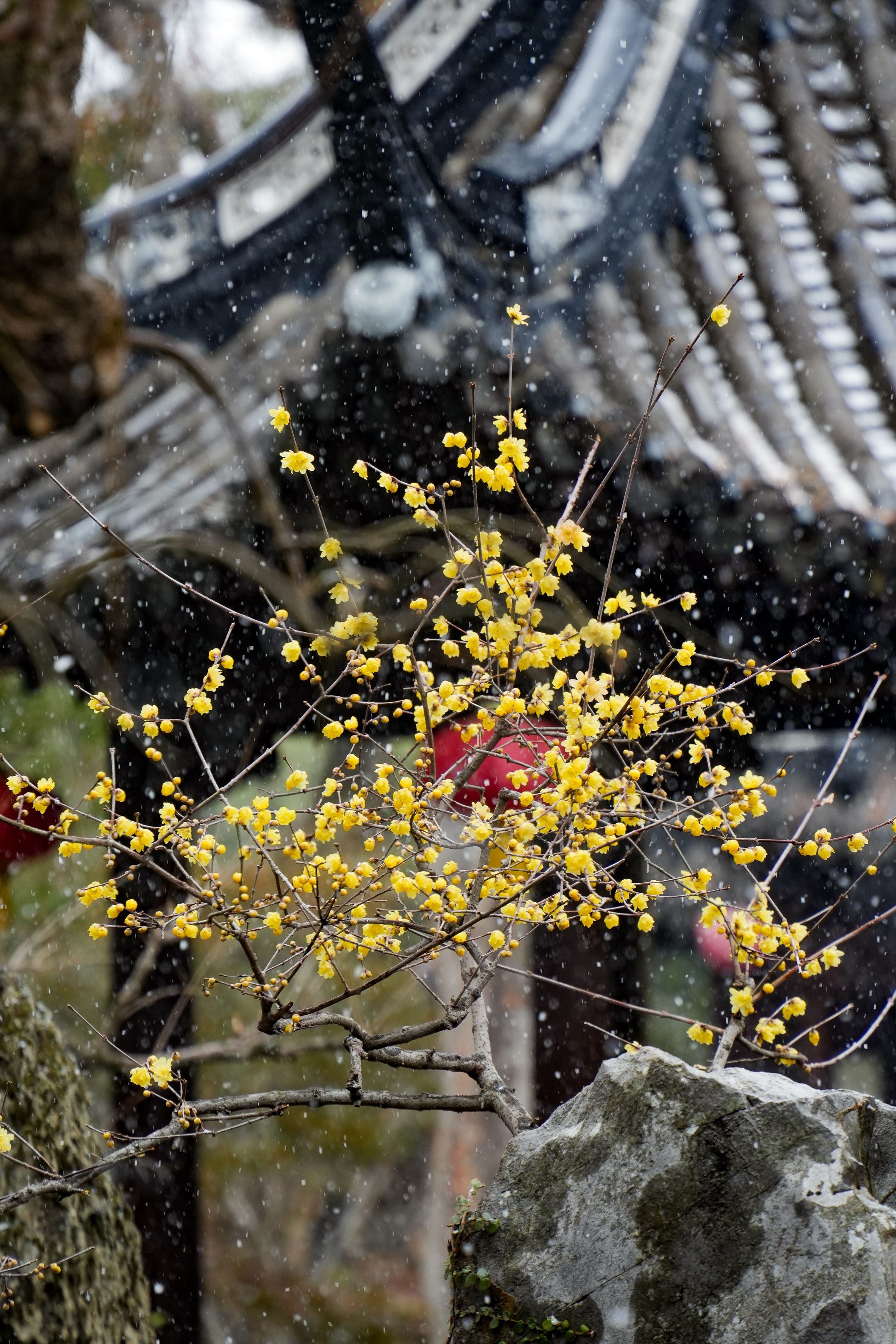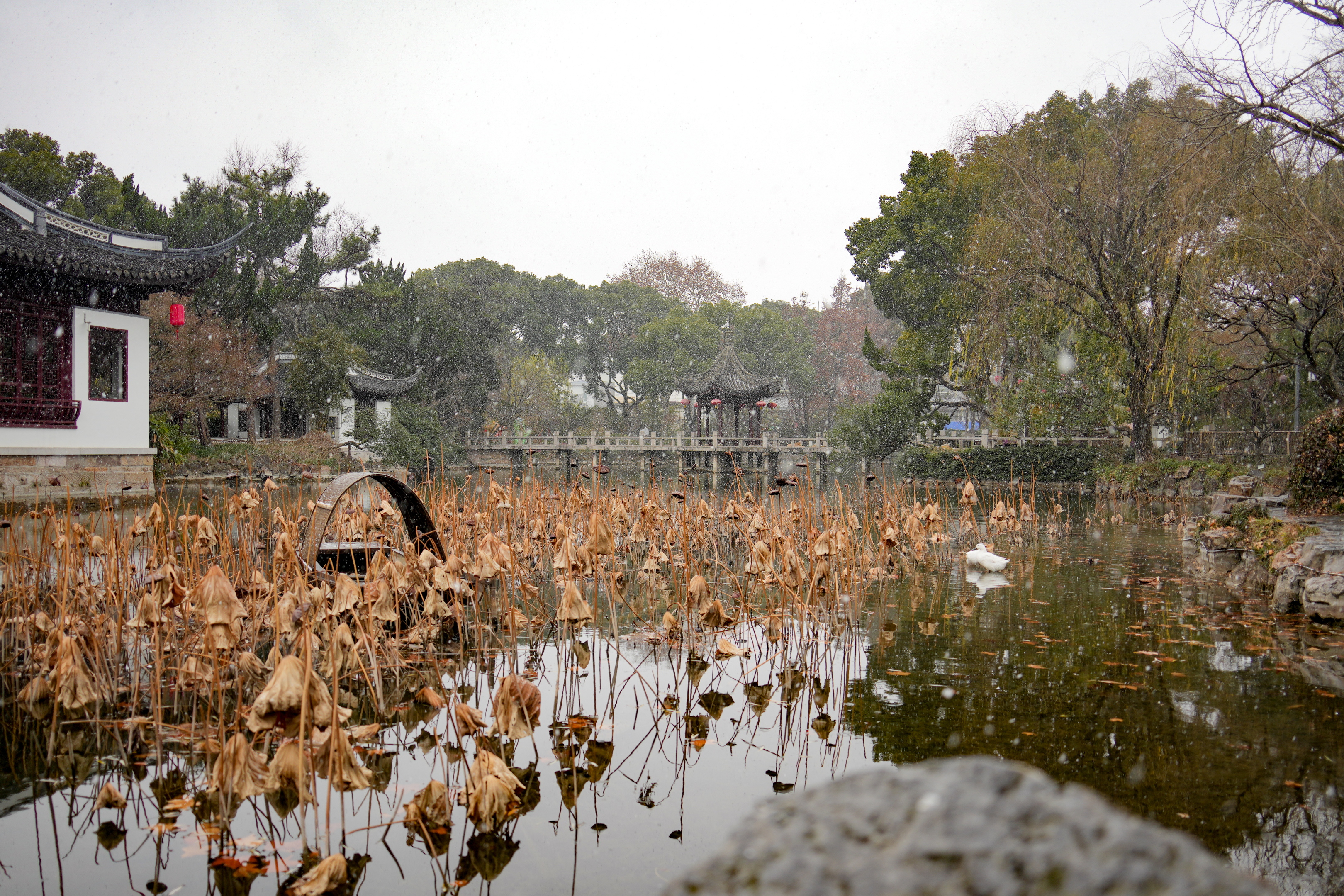 雪花纷纷扬扬地飘落,洒在古猗园的亭台楼阁、枝头树梢和池面上。亭台楼阁的屋顶戴上了一层洁白的绒帽,飞檐翘角在白雪的映衬下更加灵动,仿佛一幅淡墨的中国画。蜡梅树枝头绽放着金黄的花朵,雪花落在花瓣上,散发着幽幽清香。池塘中的残荷也披上了一层薄雪,与古朴的建筑、澄净的水面相互映衬,构成了一幅天然的画卷。